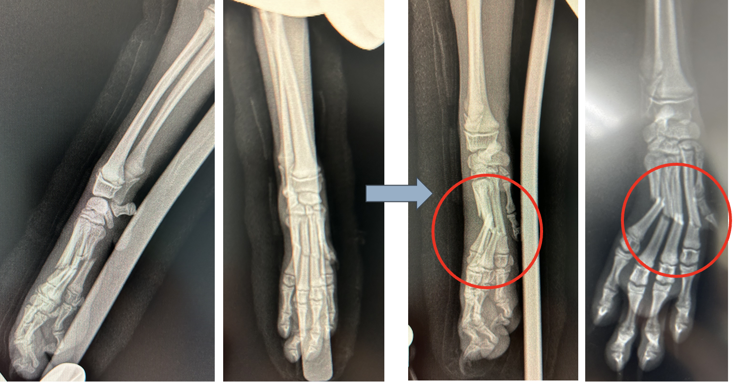 中手骨は、犬の前肢の手のひらにある細長い骨です。落下などの外傷で骨折をします。症状は、前足を挙げたり、疼痛、腫れを起こします。