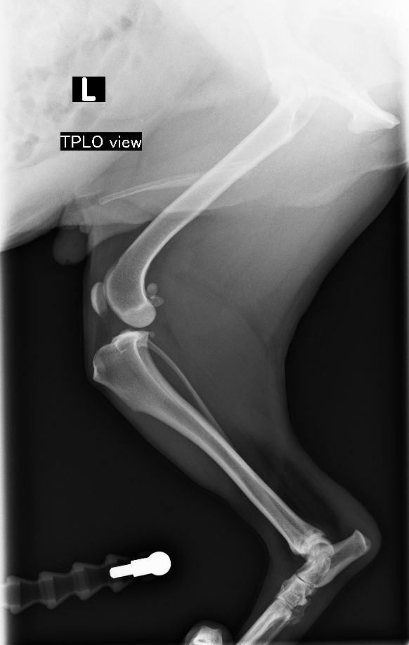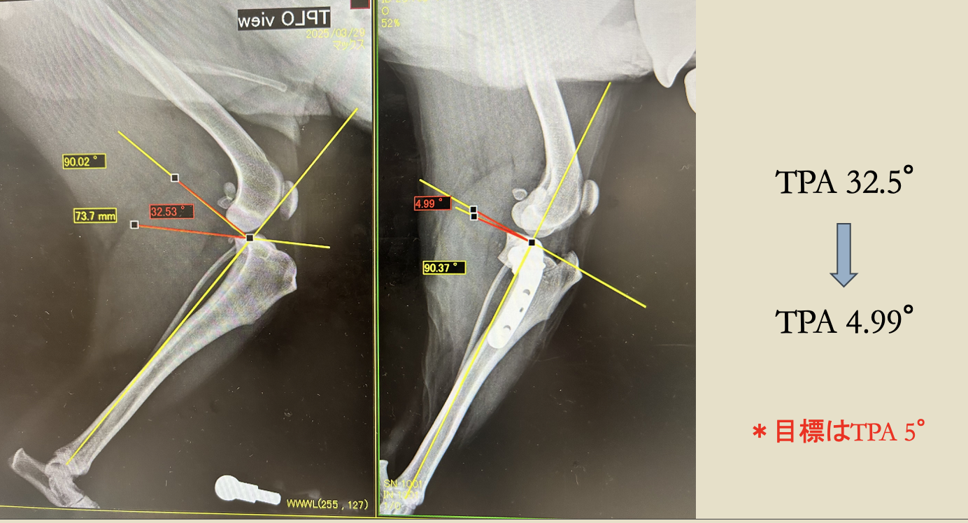 触診、レントゲン検査より、脛骨の前方変移、TPA(Tibial Plateau Angle 脛骨高平部の角度)32°が認められた
