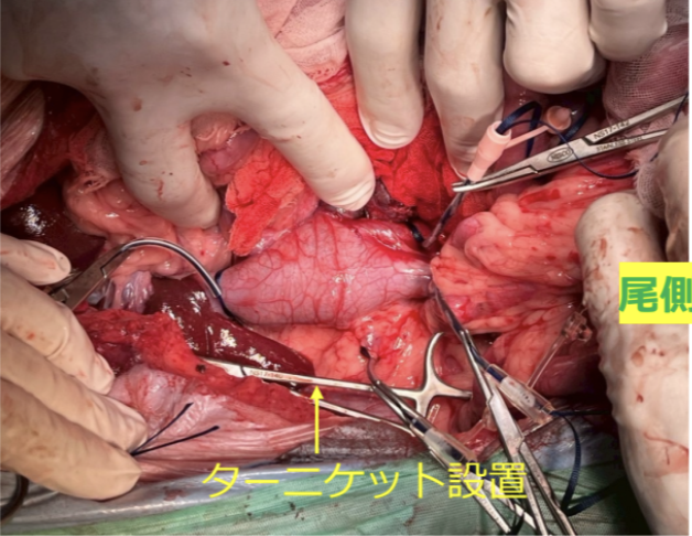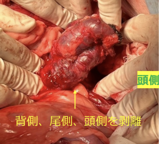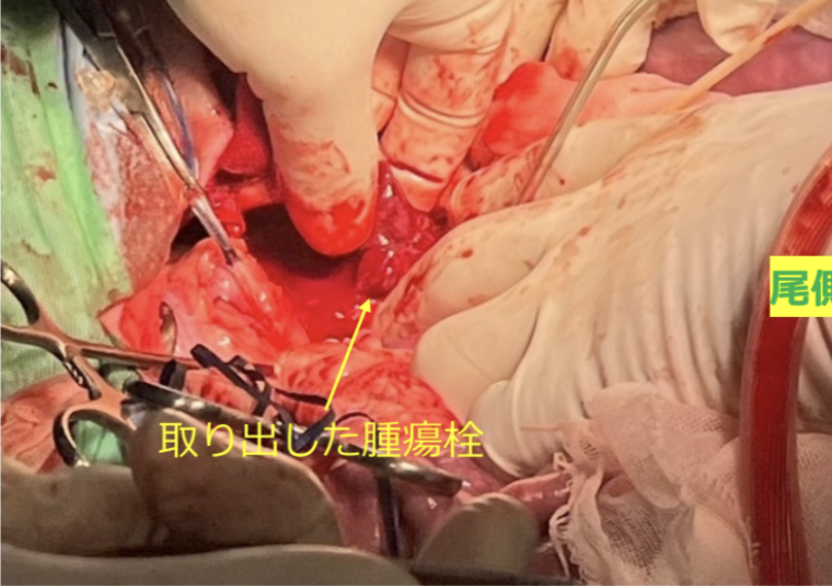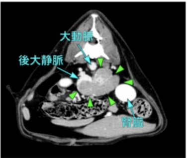 超音波検査、CT検査より、左副腎腫瘍、後大静脈浸潤(腫瘍栓)が認められた