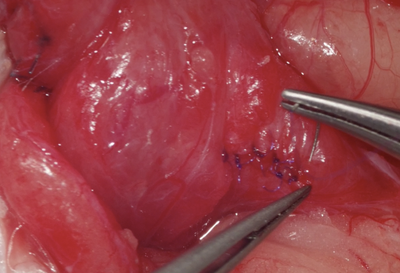 左尿管結石と診断。手術用顕微鏡下により尿管切開を行い、尿管結石を摘出した。尿管が狭窄しないように尿管〜膀胱に栄養カテーテルを設置した。