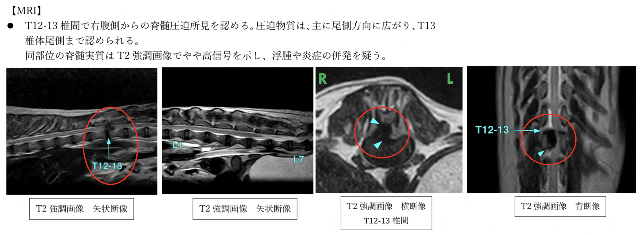CT、MRI検査より、T12-13(胸椎)右から脊髄圧迫病変が認められた。