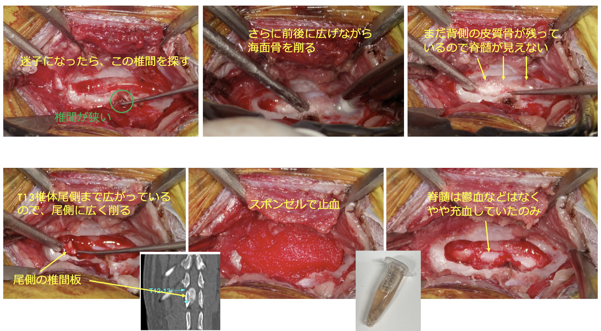 T12-13の椎間板ヘルニアと診断し、手術用顕微鏡を用いて椎間板物質を切除した。当院では最小侵襲外科に挑戦しており、今回もミニヘミラミネクトミー(ミニ片側椎弓切除術)を行った。