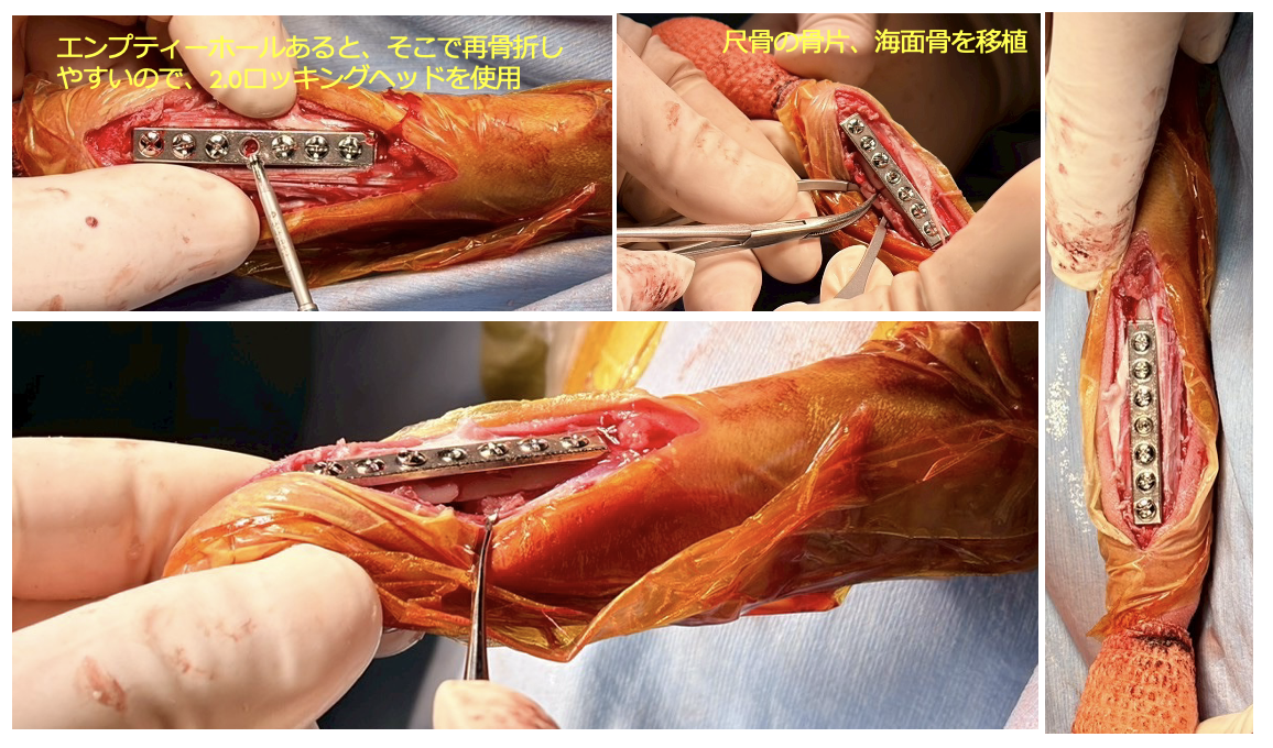 右上腕骨頭において、2.0のドリルビットを用いて皮質骨を貫通し、キュレットで海面骨を採取した