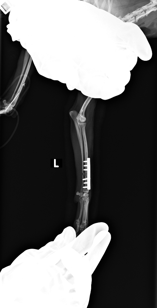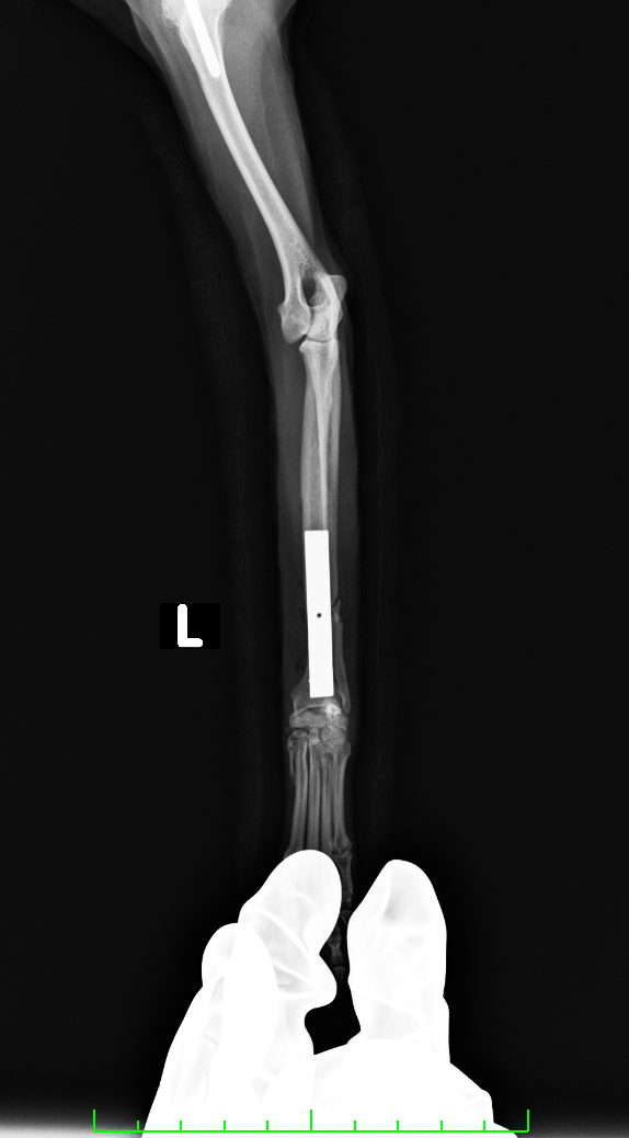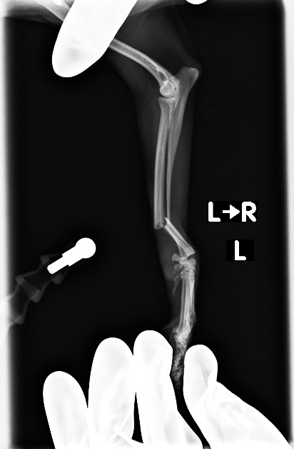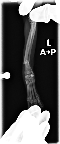 犬の前肢の骨折で最も多い骨折です。特にトイプードル、ポメラニアンなどの小型犬に多く、骨が細く、骨密度も低いため折れやすいです。