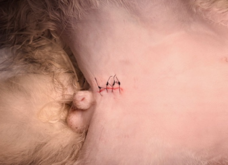 イヌやネコの精巣は生まれてから、陰嚢内に下降しますが、通常の時期を過ぎても片側あるいは両側の精巣が陰嚢内に下降せず、お腹の中や鼠径部に停留している場合を潜在精巣といいます。
