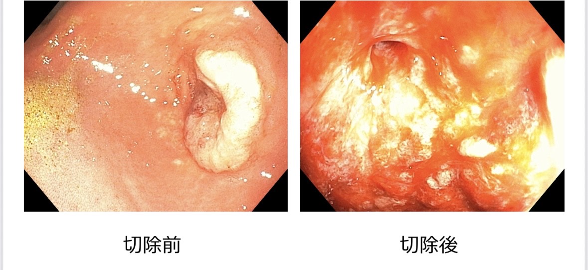 十二指腸切開を行った後に胃幽門部を切除し、ビルロートⅠ型により十二指腸、胃を吻合した。病理組織検査の結果から胃腺癌で確定診断とした。
