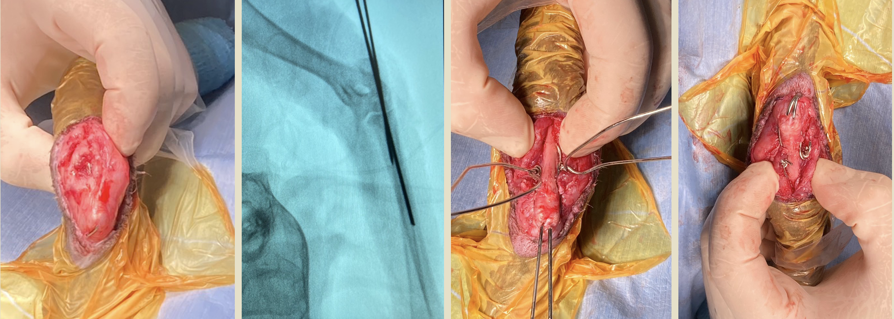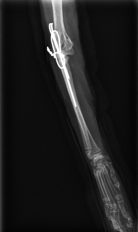 左肘頭骨折と診断し、髄内ピンとサークラージワイヤーによるテンションバンドにより固定した