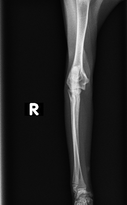 レントゲン検査より、右肘頭骨折が認められた