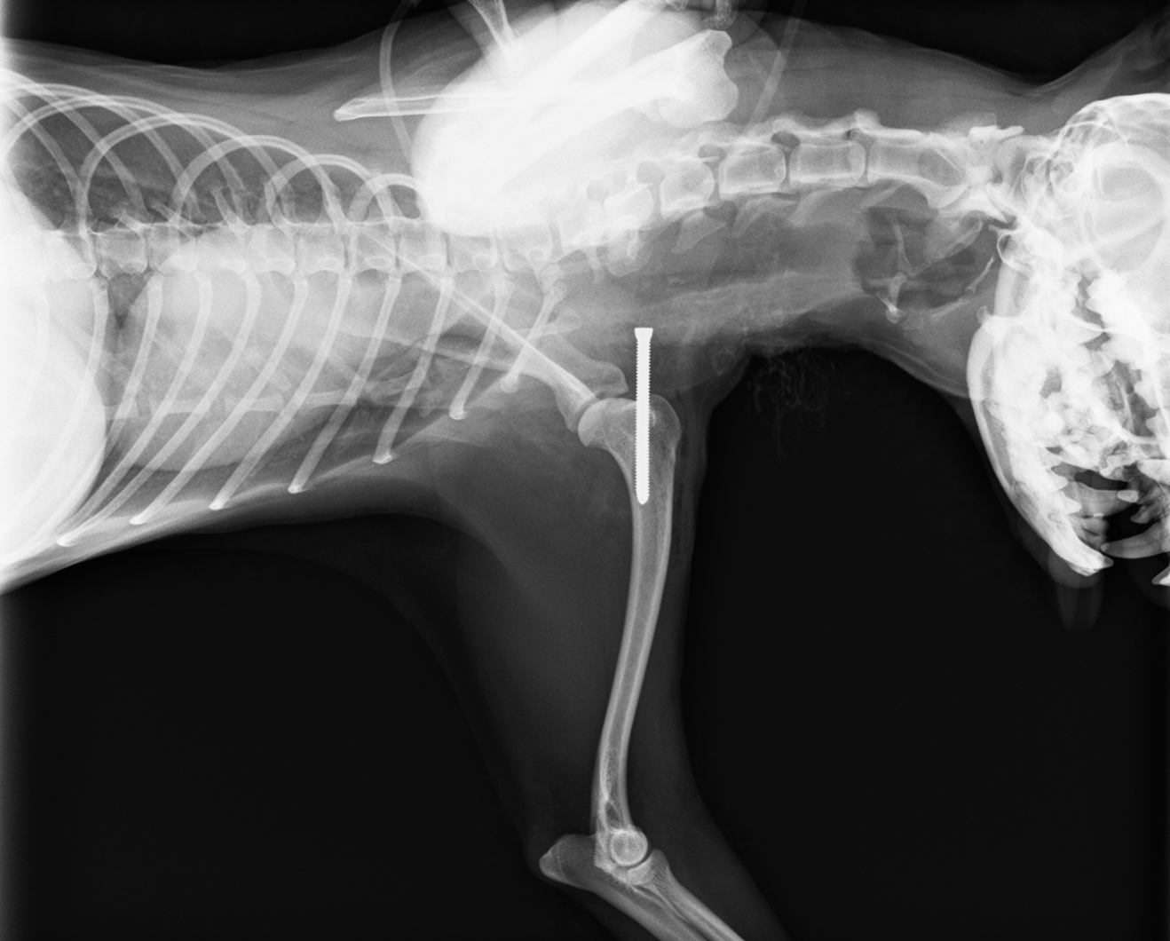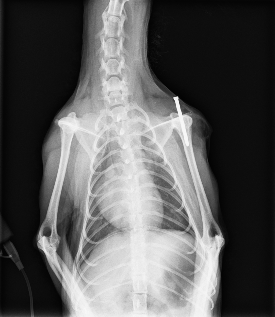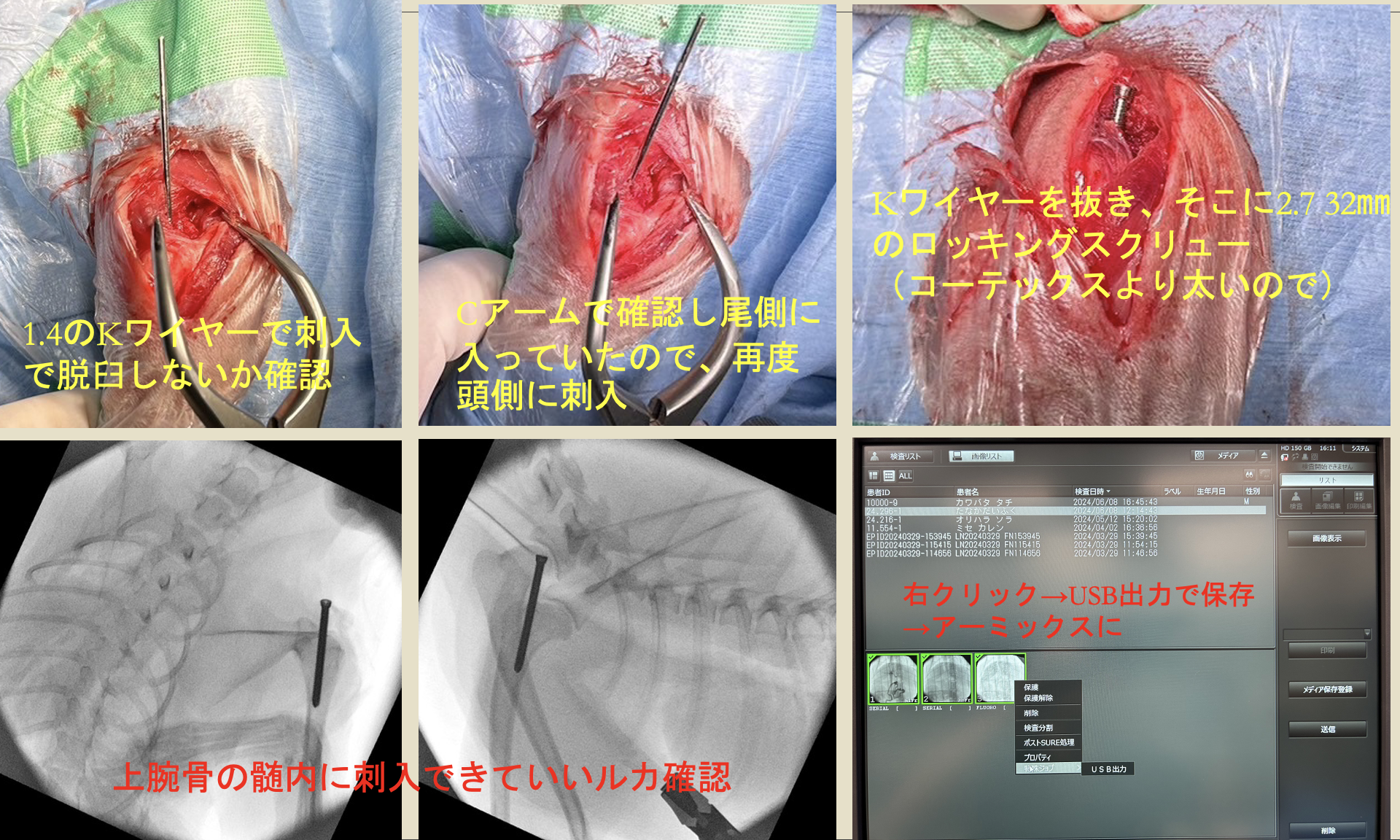 右肩関節脱臼と診断し、スクリューを上腕骨に挿入し、肩関節を安定化させる