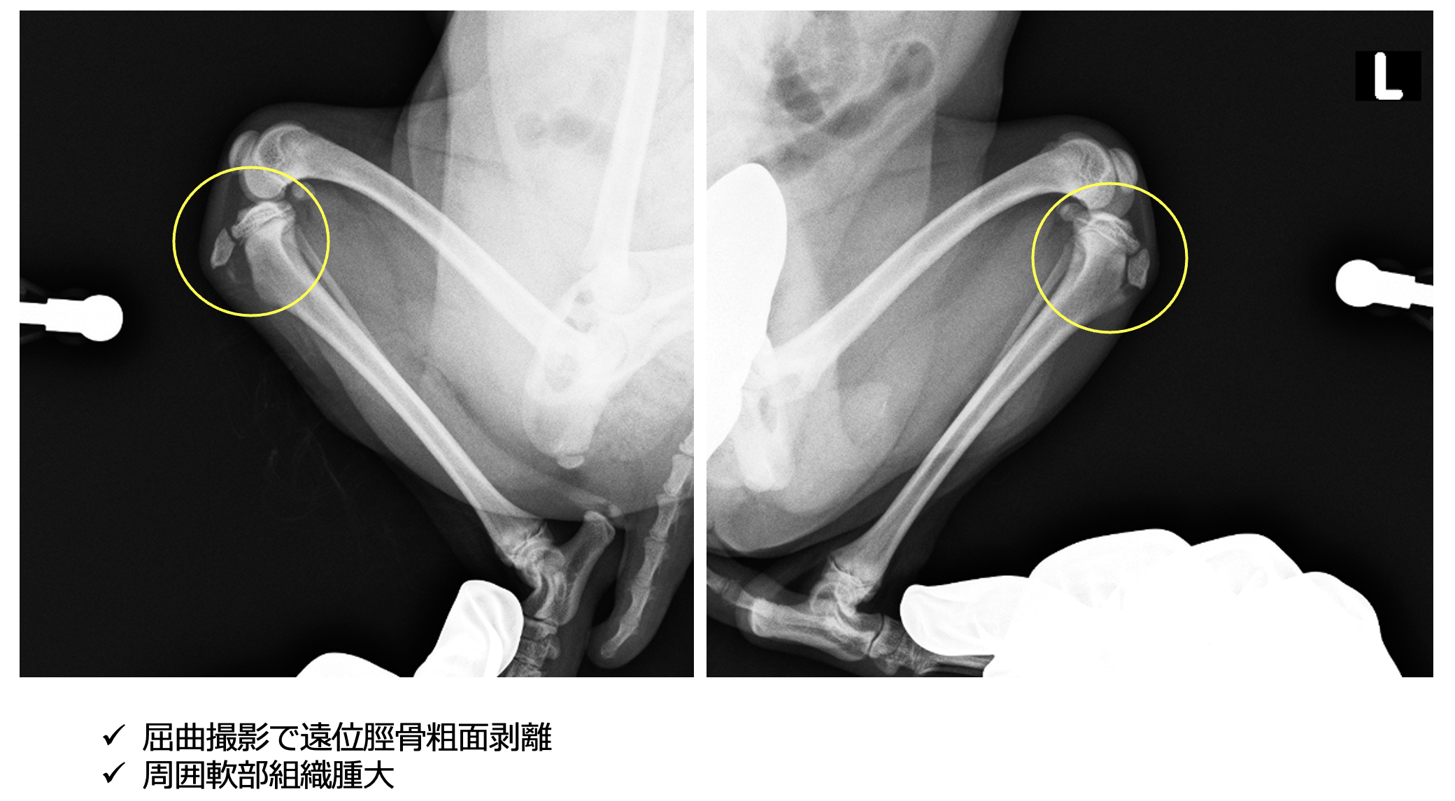 脛骨粗面とは、膝蓋骨が付着している脛骨の突起です。ここに成長板が残っているので、強い牽引力や急なジャンプなどで骨折することがあります。