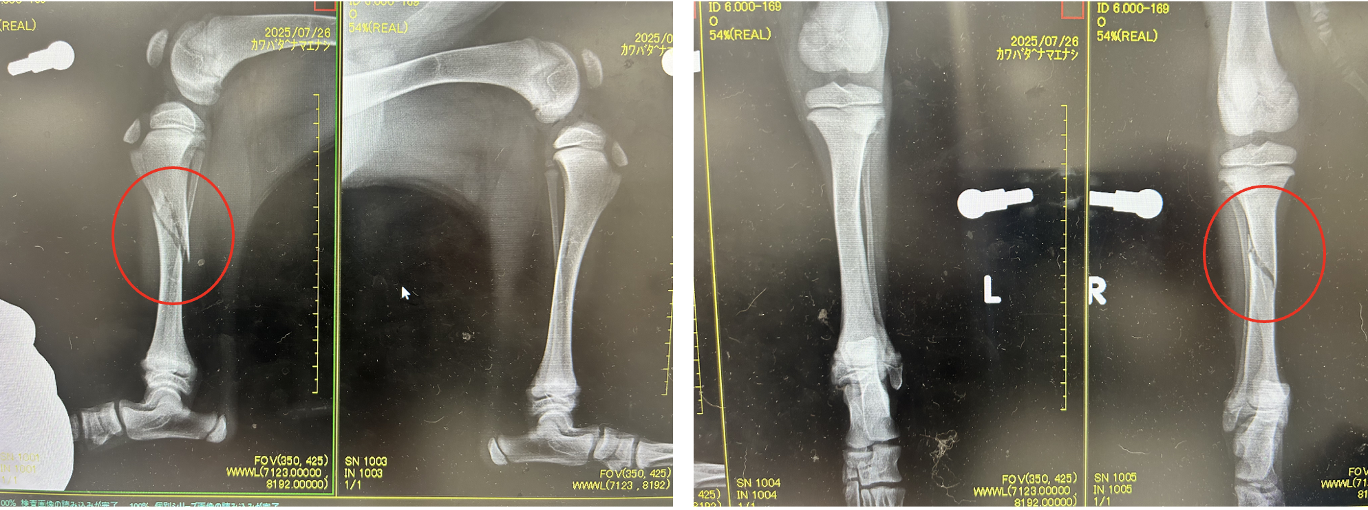 レントゲン、CTより右脛骨の斜骨折または螺旋骨折が認められた