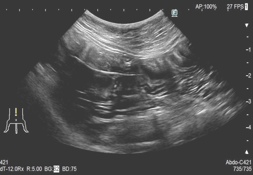 レントゲンにて胃内にX線不透過物(釣り針)、腹部エコーにてアコーディオン状に手繰り寄せられた消化管と紐状異物を確認