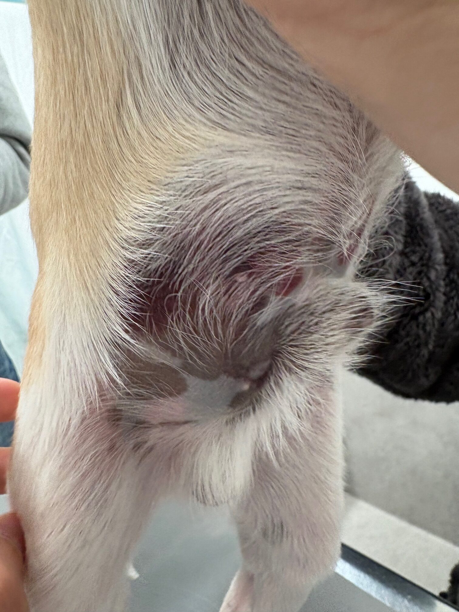 可視粘膜蒼白、背中から腹部にかけて広範囲に皮下出血、皮下点滴実施部位に血腫を疑う腫瘤がみられました。血液検査では重度貧血、APTT延長を認めました。