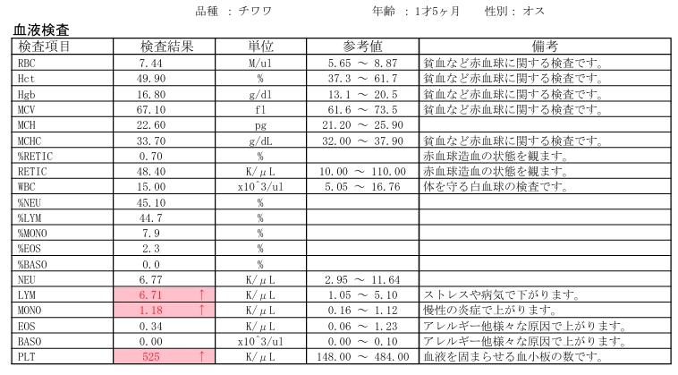 貧血がひどかったので濃厚赤血球と新鮮凍結血漿の輸血を実施しました。輸血後からは出血は治まり、貧血の悪化も認められなかったため退院としました。